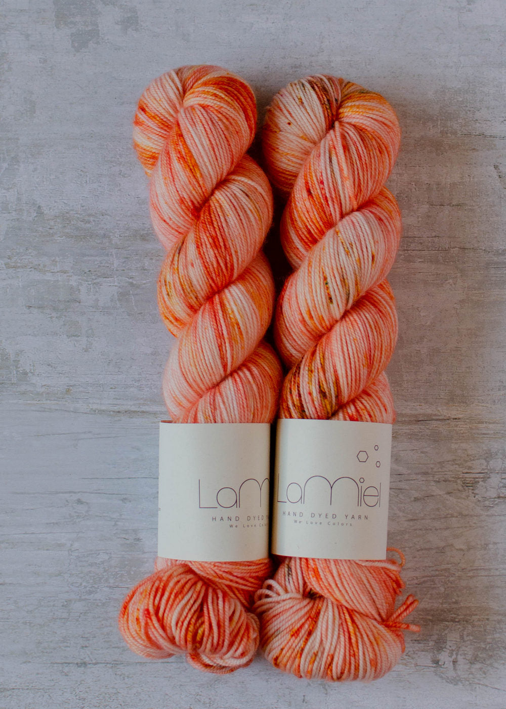 Esta lana está teñida a mano en pequeños lotes. Por la naturaleza de la técnica no existe ninguna madeja idéntica, ni siquiera en el mismo lote, siempre habrá algunas variaciones. Estas variaciones pueden incluir diferencias en el tono e intensidad de color, motas más claras o más intensas, etc. Cada madeja es única.