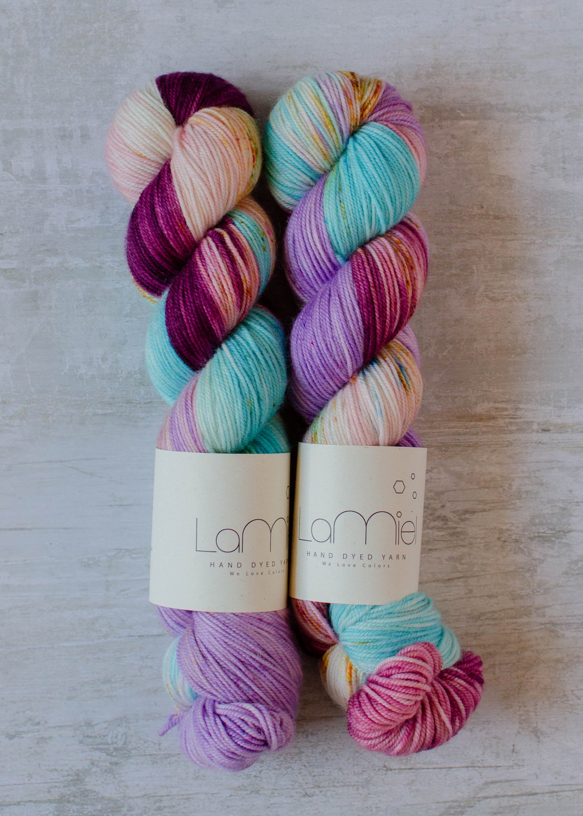 Esta lana está teñida a mano en pequeños lotes. Por la naturaleza de la técnica no existe ninguna madeja idéntica, ni siquiera en el mismo lote, siempre habrá algunas variaciones. Estas variaciones pueden incluir diferencias en el tono e intensidad de color, motas más claras o más intensas, etc. Cada madeja es única.
