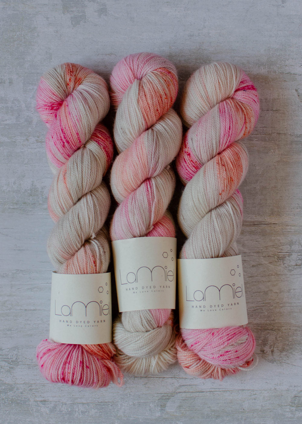 Esta lana está teñida a mano en pequeños lotes. Por la naturaleza de la técnica no existe ninguna madeja idéntica, ni siquiera en el mismo lote, siempre habrá algunas variaciones. Estas variaciones pueden incluir diferencias en el tono e intensidad de color, motas más claras o más intensas, etc. Cada madeja es única.