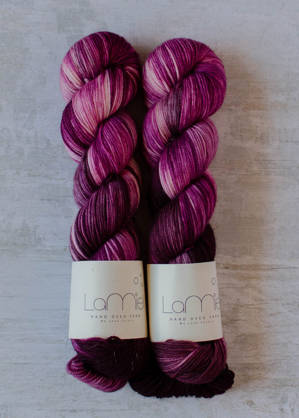 Esta lana está teñida a mano en pequeños lotes. Por la naturaleza de la técnica no existe ninguna madeja idéntica, ni siquiera en el mismo lote, siempre habrá algunas variaciones. Estas variaciones pueden incluir diferencias en el tono e intensidad de color, motas más claras o más intensas, etc. Cada madeja es única.