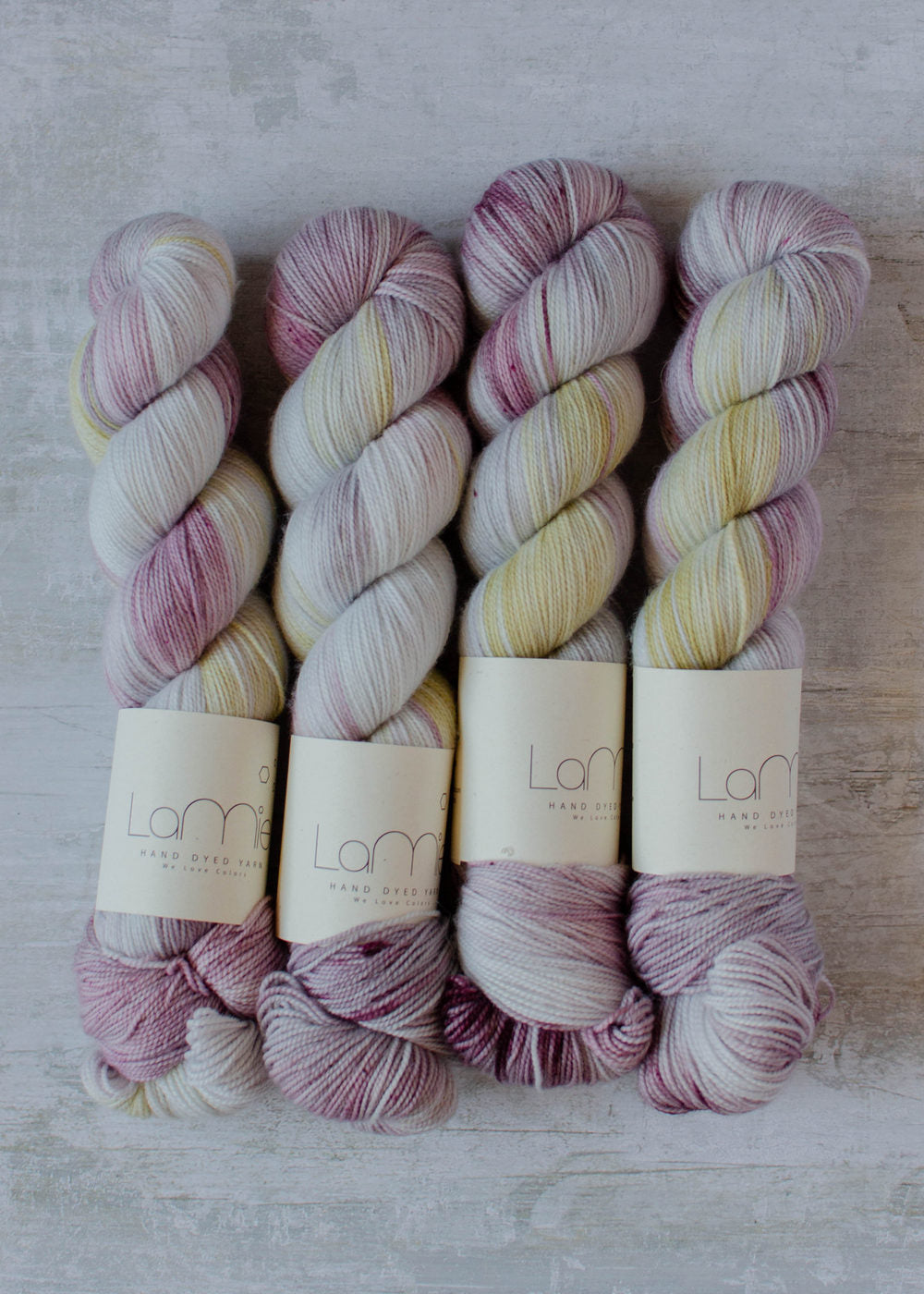 Esta lana está teñida a mano en pequeños lotes. Por la naturaleza de la técnica no existe ninguna madeja idéntica, ni siquiera en el mismo lote, siempre habrá algunas variaciones. Estas variaciones pueden incluir diferencias en el tono e intensidad de color, motas más claras o más intensas, etc. Cada madeja es única.
