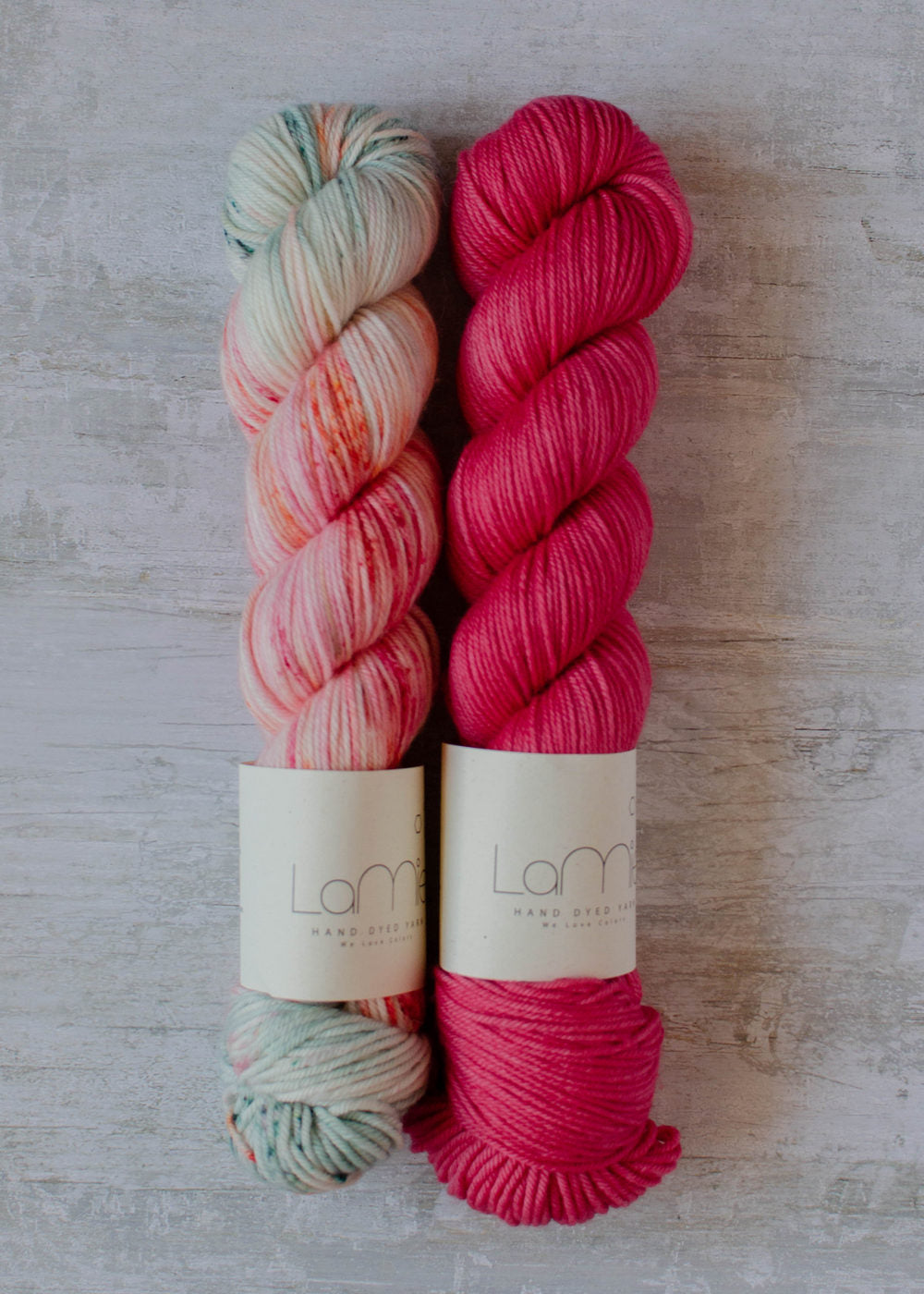 Súper oferta!! Pack compuesto por dos madejas de la calidad Rosemary DK en los colores Kaladium y Atomic Pink. Este pack puede estar compuesto por distintas tintadas, puedes ver las madejas en la foto.