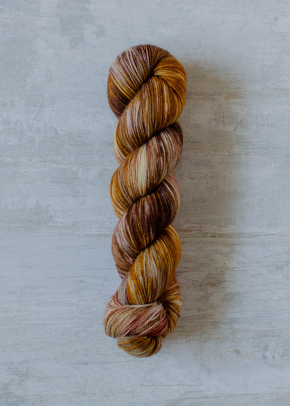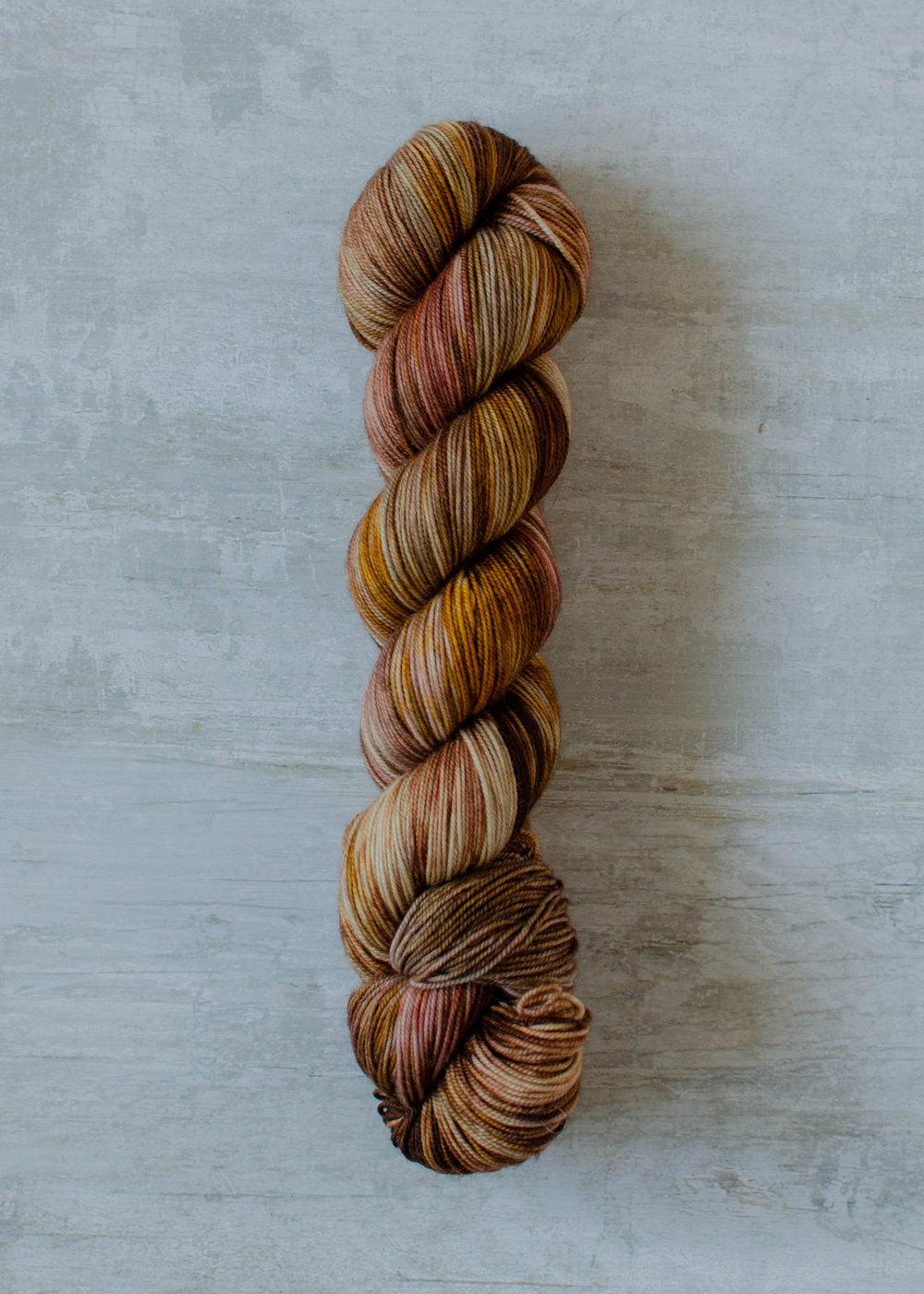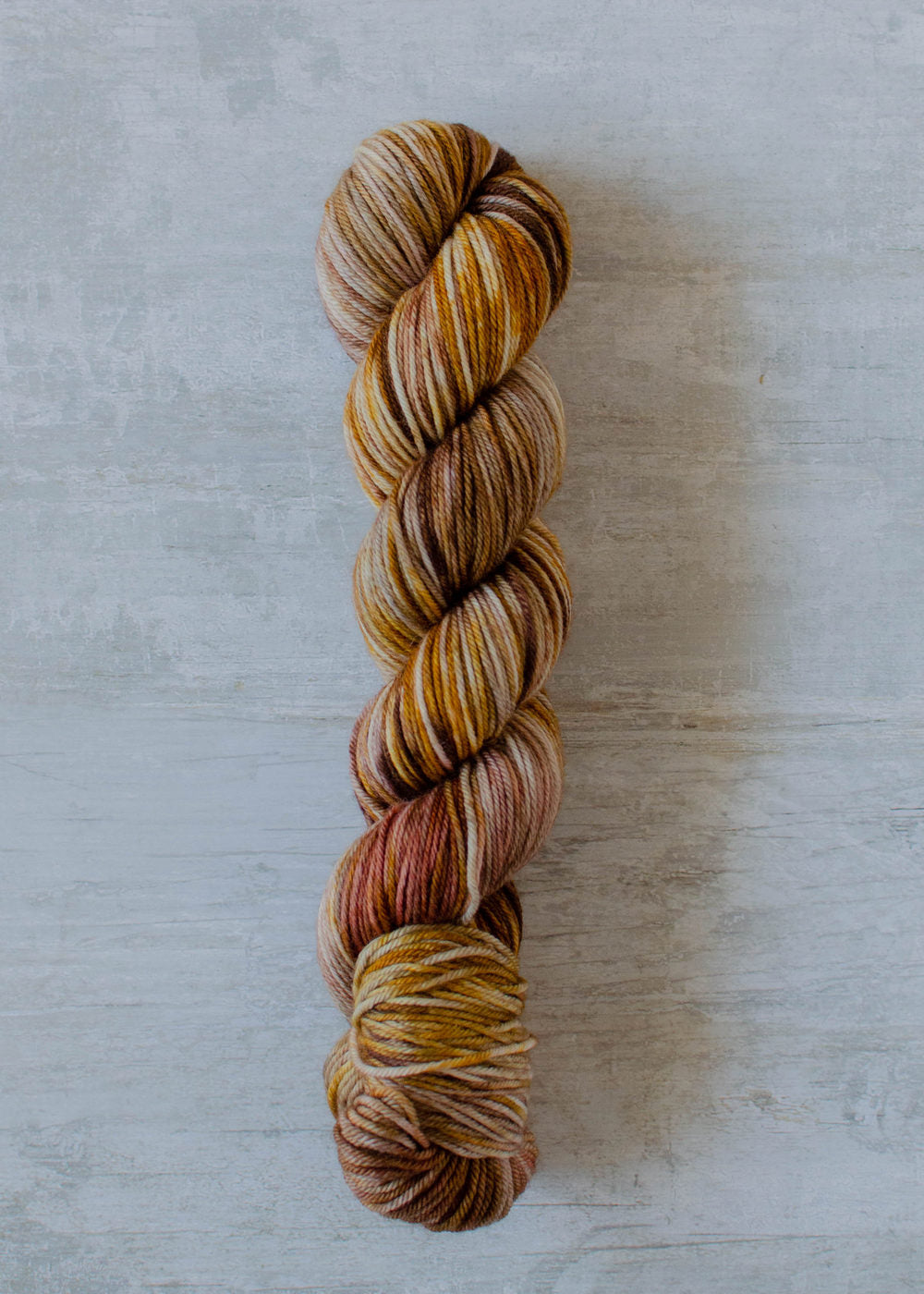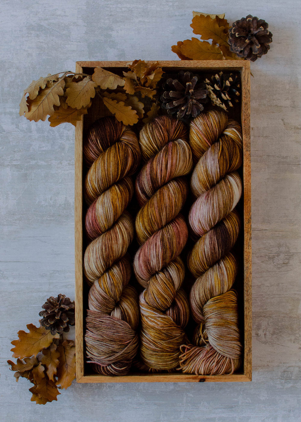 Woodland es una madeja color variegado en tonos marrones, dorados con toques caoba.