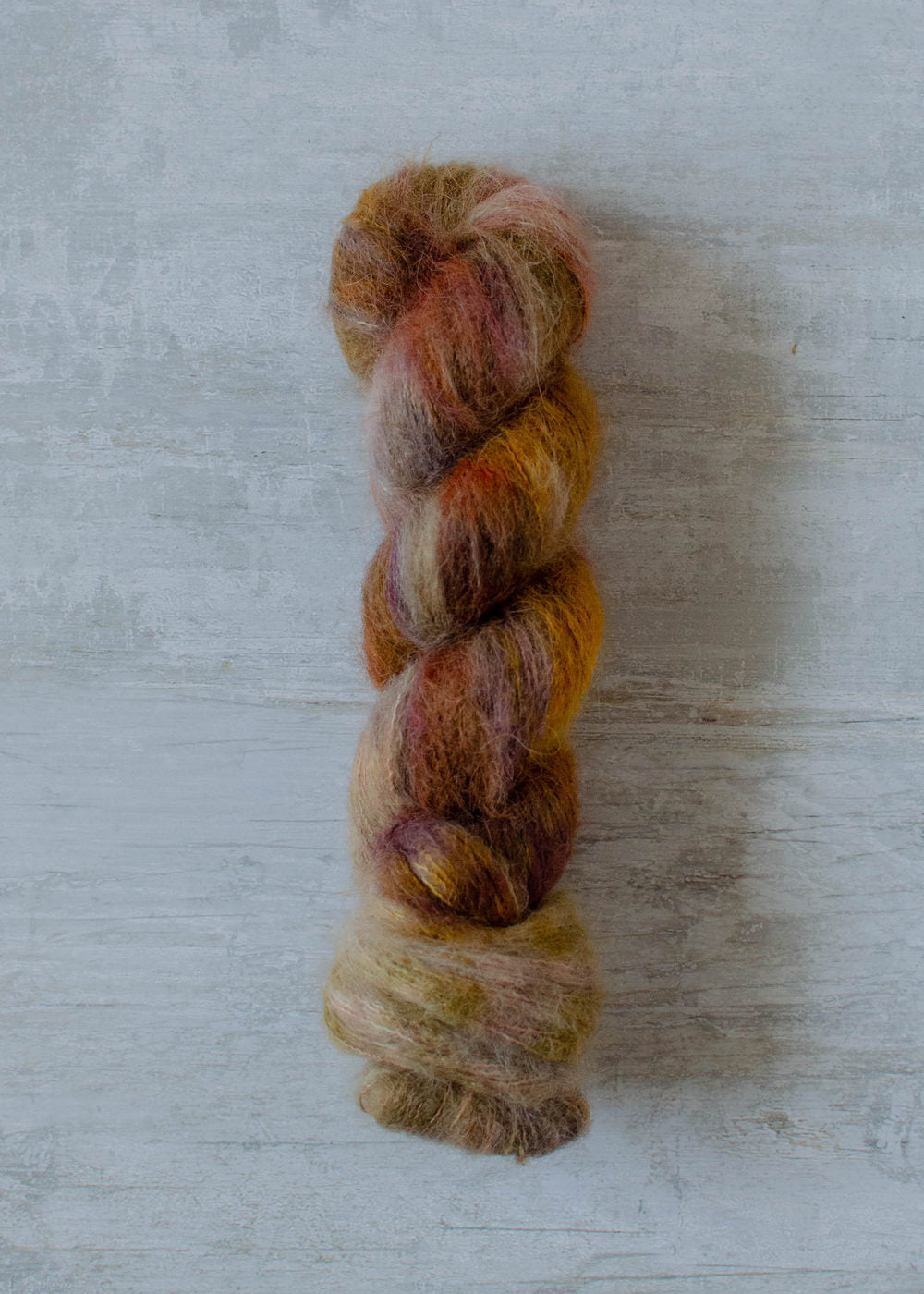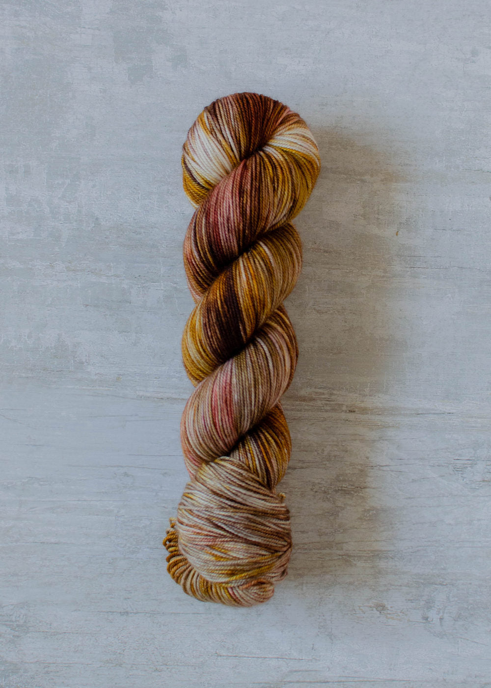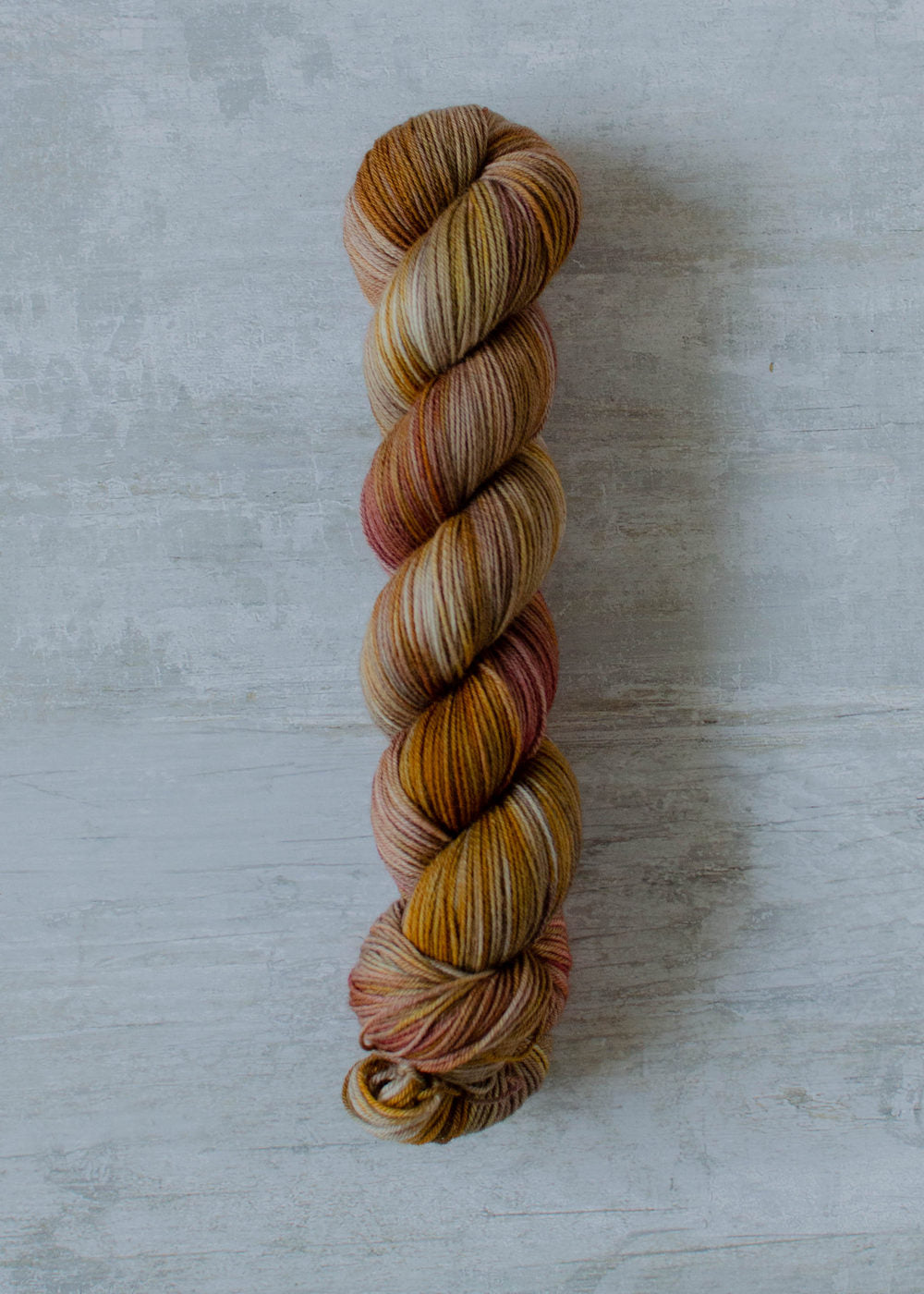 Esta lana está teñida a mano en pequeños lotes. Por la naturaleza de la técnica no existe ninguna madeja idéntica, ni siquiera en el mismo lote, siempre habrá algunas variaciones. Estas variaciones pueden incluir diferencias en el tono e intensidad de color, motas más claras o más intensas, etc. Cada madeja es única.